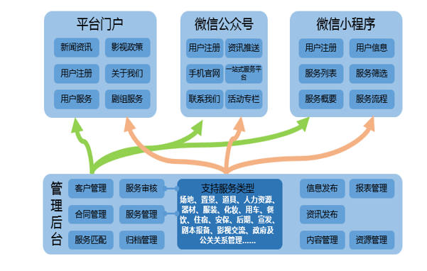 平台门户包括新闻资讯、影视政策、用户注册、用户服务、剧组服务、关于我们和联系我们等功能。