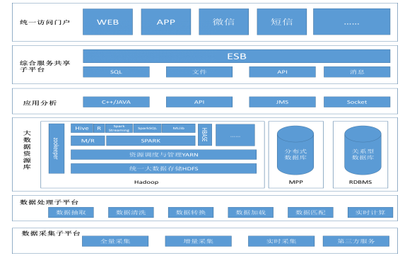 企业大数据综合自助分析采用云计算、大数据技术,可以满足资源统一管理能力、计算能力线性扩展、数据汇总能力;采取Hadoop的Map/Reduce、Hive、Spark SQL配合MPP数据库和关系型数据库的等技术完成。